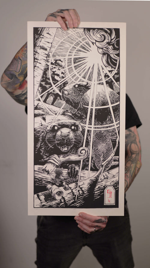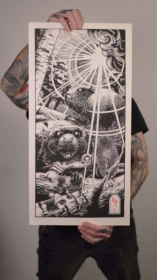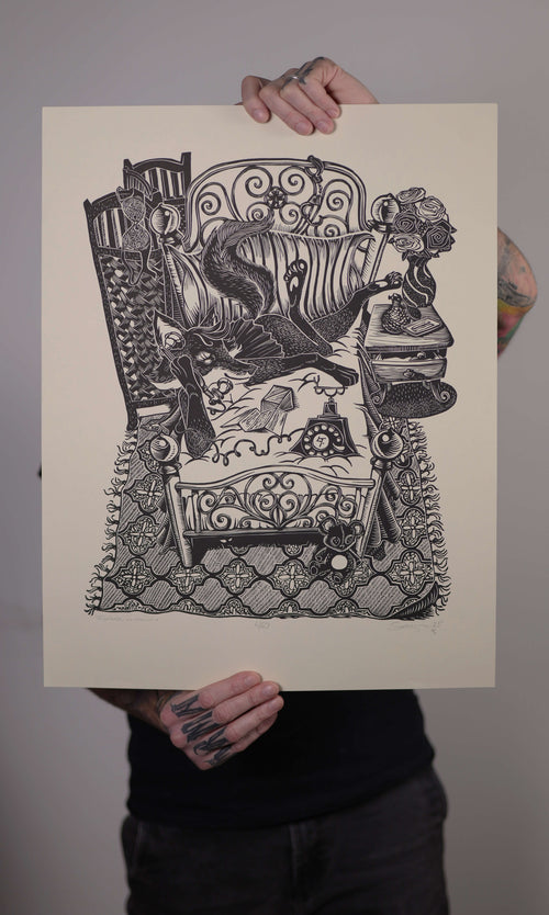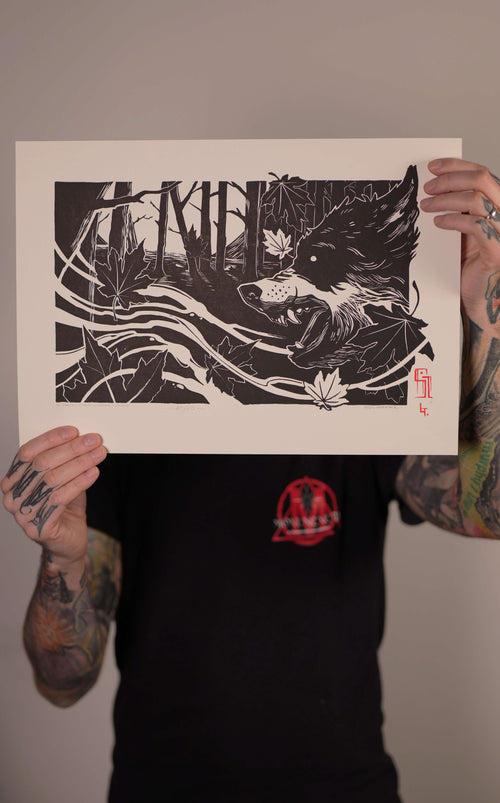 A traditional handprinting technique, where I carve my own design's into a linoleum sheet and then transfer it onto paper with ink. Every print is made by hand, so no two are exactly alike. The process leaves subtle marks from the carving, giving each piece its own character and unique charm.